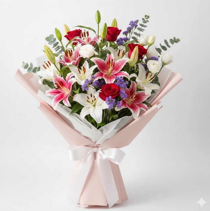 Como una melodía visual que celebra la vida y el afecto, la Serenata de Lirios es una celebración a la frescura y la delicadeza. Este bouquet combina tonalidades pasteles con destellos vibrantes, creando una pieza equilibrada y llena de luz.